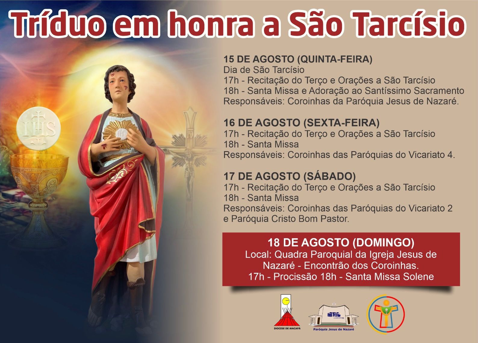 Com o objetivo de preparar espiritualmente os jovens e adolescentes para o encontrão de domingo, um tríduo festivo tem início na quarta-feira,15, quando a Igreja faz memória a São Tarcísio – padroeiro dos coroinhas e acólitos – e vai até sábado 17. As celebrações começam às 17h, na igreja matriz da paróquia.
