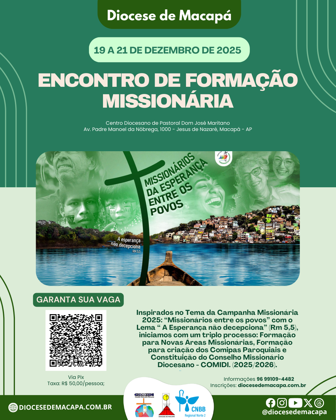 Inspirados no Tema da Campanha Missionária 2025: “Missionários entre os povos” com o Lema “ A Esperança não decepciona” (Rm 5,5), iniciamos com um triplo processo: Formação para Novas Áreas Missionárias, Formação para criação dos Comipas Paroquiais e Constituição do Conselho Missionário Diocesano – COMIDI. (2025/2026).