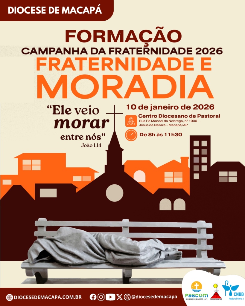 A Diocese de Macapá realizará, no dia 10 de janeiro de 2026, a Formação da Campanha da Fraternidade 2026, reunindo agentes pastorais, lideranças e membros das comunidades para um momento de estudo, reflexão e preparação pastoral. A atividade acontecerá a partir das 8h, no Centro Diocesano de Pastoral.