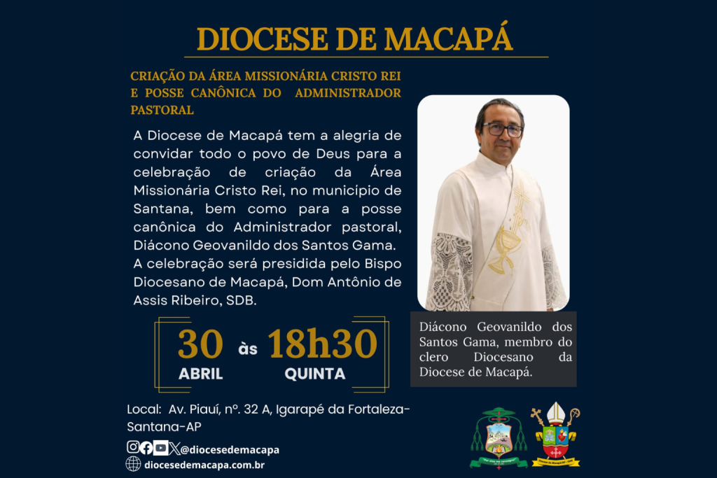 Celebração de criação acontece dia 30 de abril. MACAPÁ (AP) – Por Redação Pascom A Diocese de Macapá realiza, no próximo dia 30 de abril, a celebração de criação da Área Missionária Cristo Rei, no município de Santana no bairro Igarapé da Fortaleza. Juntamente com a missa de criação da Área acontece a posse canônica do primeiro […]
